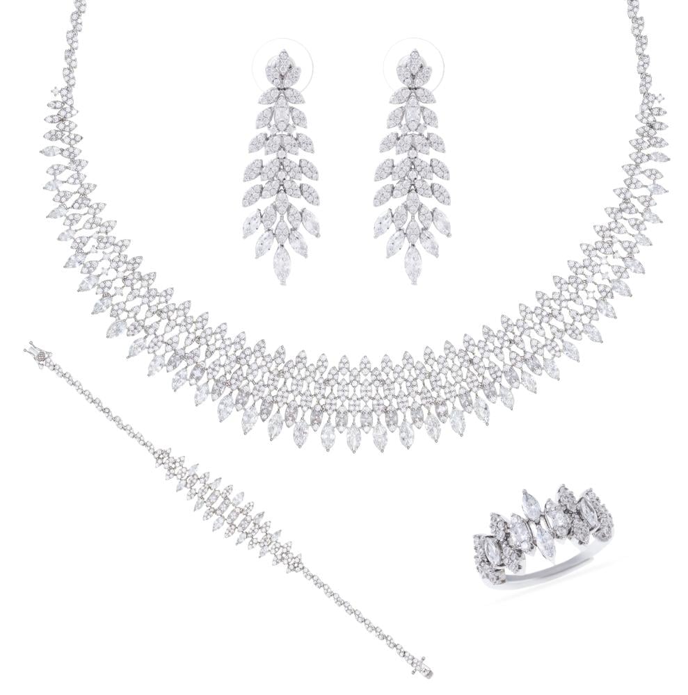 - طقم مجوهرات فاخر مكون من سلسال وسوار وحلق وخاتم يمنحكِ إطلالة راقية تناسب جميع المناسبات.