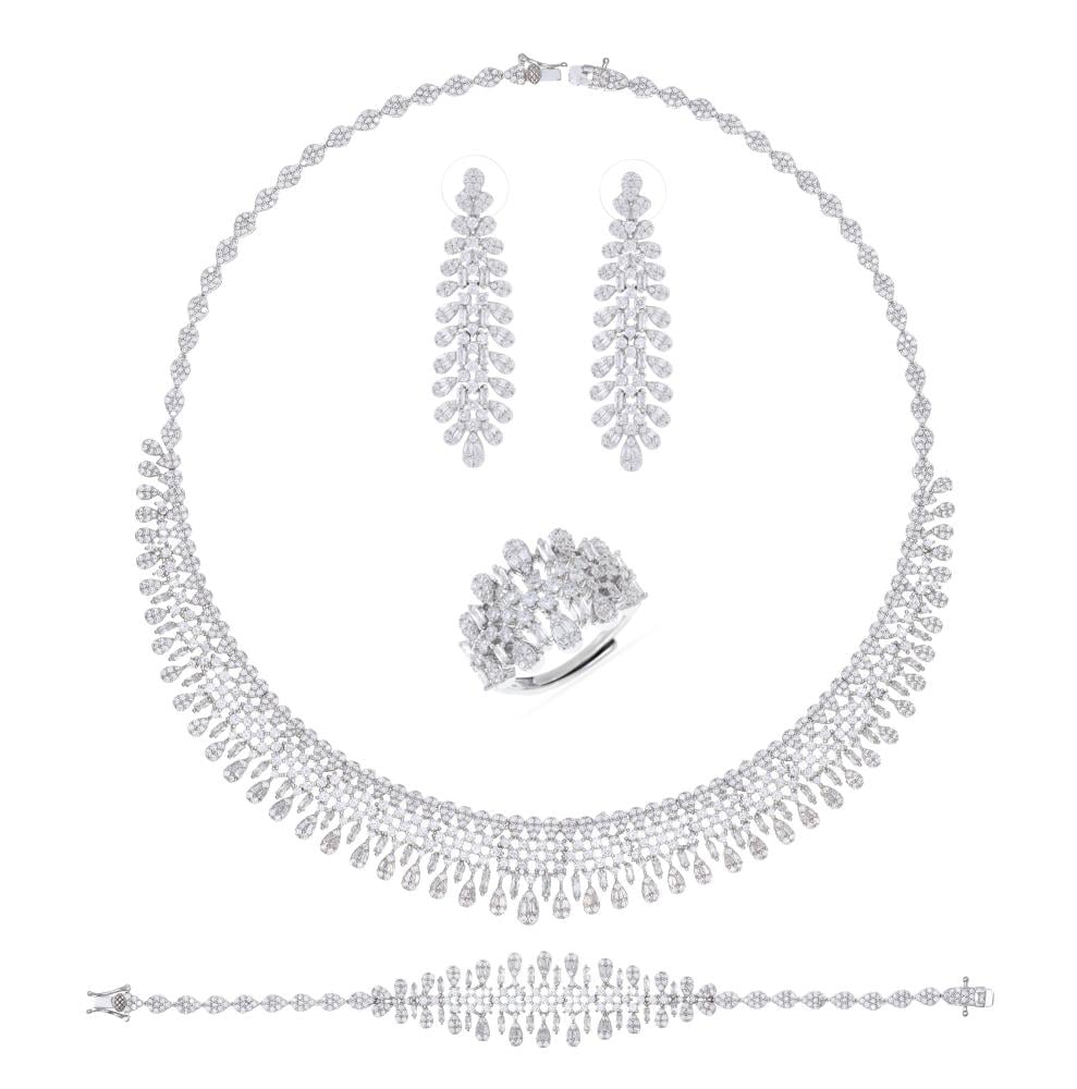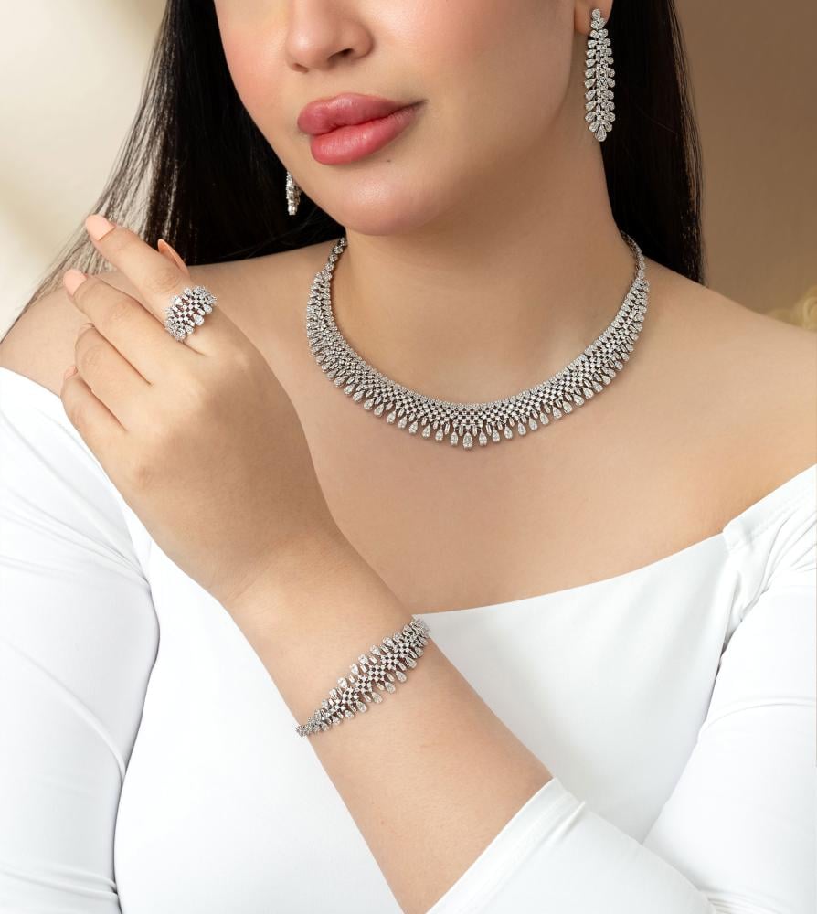 ليس كل المجوهرات تُصنع لتُرتدى بعضها يُصنع ليُبهر! طقم مجوهرات فضي صُمم خصيصًا لمن تعشق الفخامة والتألق.
